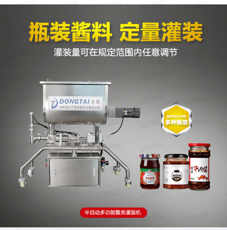 辣椒醬灌裝機 適合于將各類粘稠體及含有各種固體物質如辣椒、花生、肉塊、佐料等物體的醬類和油、料分離的火鍋底料等灌裝于各種容器中,辣椒醬灌裝機 適用于辣椒醬、顆粒醬料、大塊肉醬、火鍋底料等的灌裝。辣椒醬灌裝機 /半自動辣椒醬灌裝機可灌裝顆粒漿狀流體物料,特別適用于調味品中帶顆粒并且濃度較大的辣椒醬、火鍋底料等粘稠醬類的灌裝,配置的自動攪拌器,辣椒醬灌裝機 保證了醬和油的充分混合,又稱為辣椒醬灌裝機、花生醬灌裝機、豆瓣醬灌裝機、果醬灌裝機,芝麻醬灌裝機、粘稠醬類灌裝機、牛肉醬灌裝機。