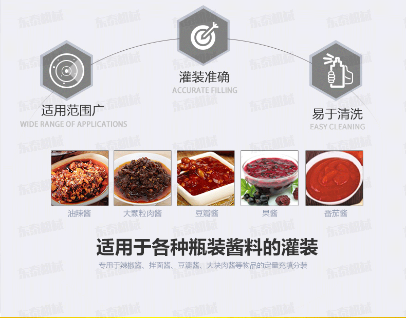4、顆粒醬定量灌裝機主要針對食品行業的醬類分裝設計生產,香菇醬灌裝機特別適用于調味品中帶顆粒并且濃度較大的辣椒醬、豆瓣醬、花生醬、芝麻醬、果醬、牛油火鍋底料、紅油火鍋底料等物質的粘稠醬類的灌裝;
