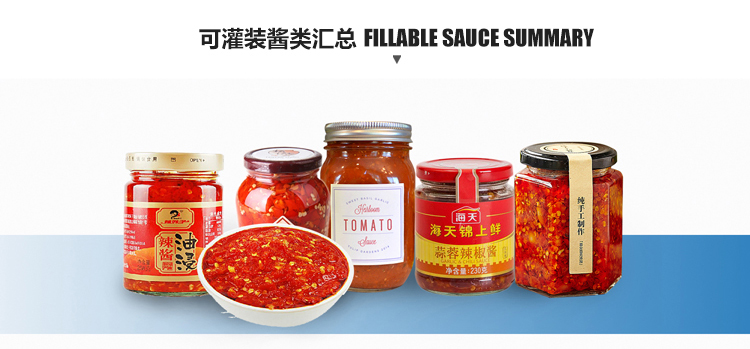 如果是瓶裝的話,可以建議使用我們的辣椒醬灌裝旋蓋一體機。在一臺機械上實現上蓋灌裝抽真空旋蓋等動作。該設備可以通過大顆粒醬料,攪拌均勻,具有灌裝精密,運行穩定可靠、工作效率高、壽命長、維護間單等特點。廣泛適用于各種含顆粒的半流體、膏體、醬料的灌裝,也可灌裝各種粘稠體等,價格方面也非常合適。