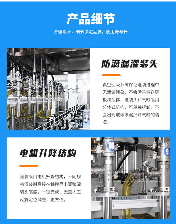 1.灌裝頭采用國家知識產權局認證的實用新型:真空回吸防滴漏灌裝頭;