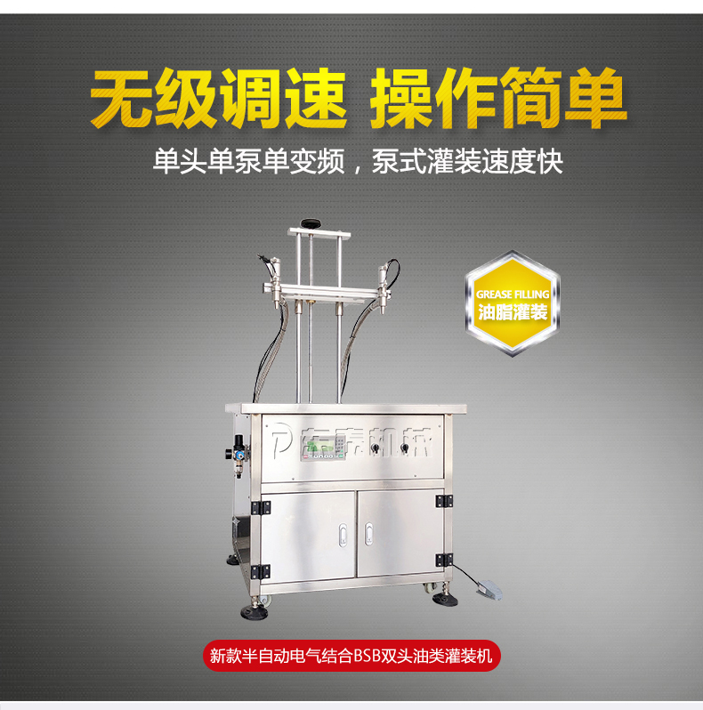 大型機械設備占滿了工廠的一個個產房,廠家對大機械的制造非常的細致,可小型的機械設備中同樣蘊含了設計師的大智慧,這款雙頭食用油灌裝機,雖然小型可蘊含的科技一樣也不少,這款雙頭食用油灌裝機,擁有著單頭單泵單變頻獨立控制,壓力恒定,流速更穩定,單頭可以直接進行修改,誤差更是保證了在了1%左右。整機采用了不銹鋼材質,完全符合食品級的要求,以及各種的優點。
