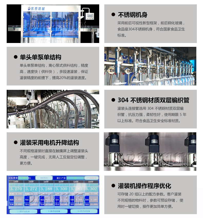 驅(qū)動方式更是通過伺服電機配合滾珠絲杠帶動相應(yīng)料缸內(nèi)的活塞做往復(fù)運動,從而讓料缸前腔產(chǎn)生負(fù)壓,以電機脈沖控制電機旋轉(zhuǎn)并控制活塞行程,從而調(diào)節(jié)灌裝量。驅(qū)動的方式應(yīng)用于容積柱塞式灌裝方式,這種灌裝方式和物料接觸部分均為不銹鋼316L 材質(zhì),灌裝過程中無污染,各物料轉(zhuǎn)換清洗方便,車間灌裝結(jié)束設(shè)備維護(hù)清洗便捷,大大優(yōu)于自流其他灌裝方式。氣缸驅(qū)動相比伺服驅(qū)動針對灌裝的計量范圍更加廣泛靈活,針對客戶多種灌裝規(guī)格的需求服驅(qū)動方式調(diào)整方便,僅需在觸摸屏上設(shè)置即可,一般出廠可以根據(jù)客戶常用規(guī)格直接寫入程序。伺服驅(qū)動方式灌裝速度快,不受氣壓的影響,灌裝速度可控。總之:伺服驅(qū)動方式在操作使用、精度誤差、整機調(diào)整、設(shè)備清洗、維護(hù)保養(yǎng)等方面更加方便客戶使用。并且我們公司有著優(yōu)質(zhì)的售后服務(wù)團隊為您以后的使用保駕護(hù)航。